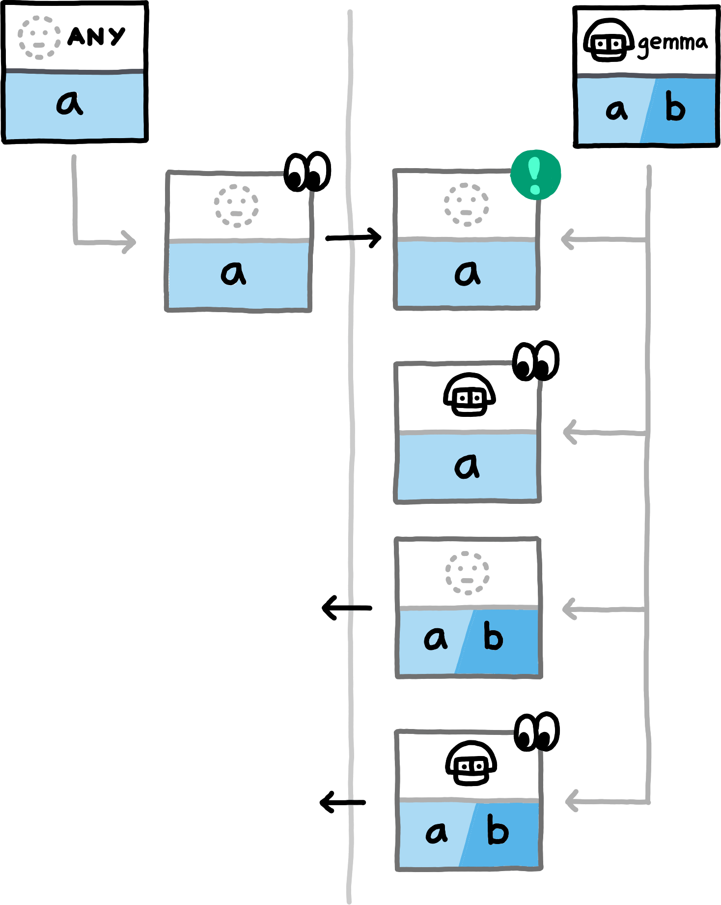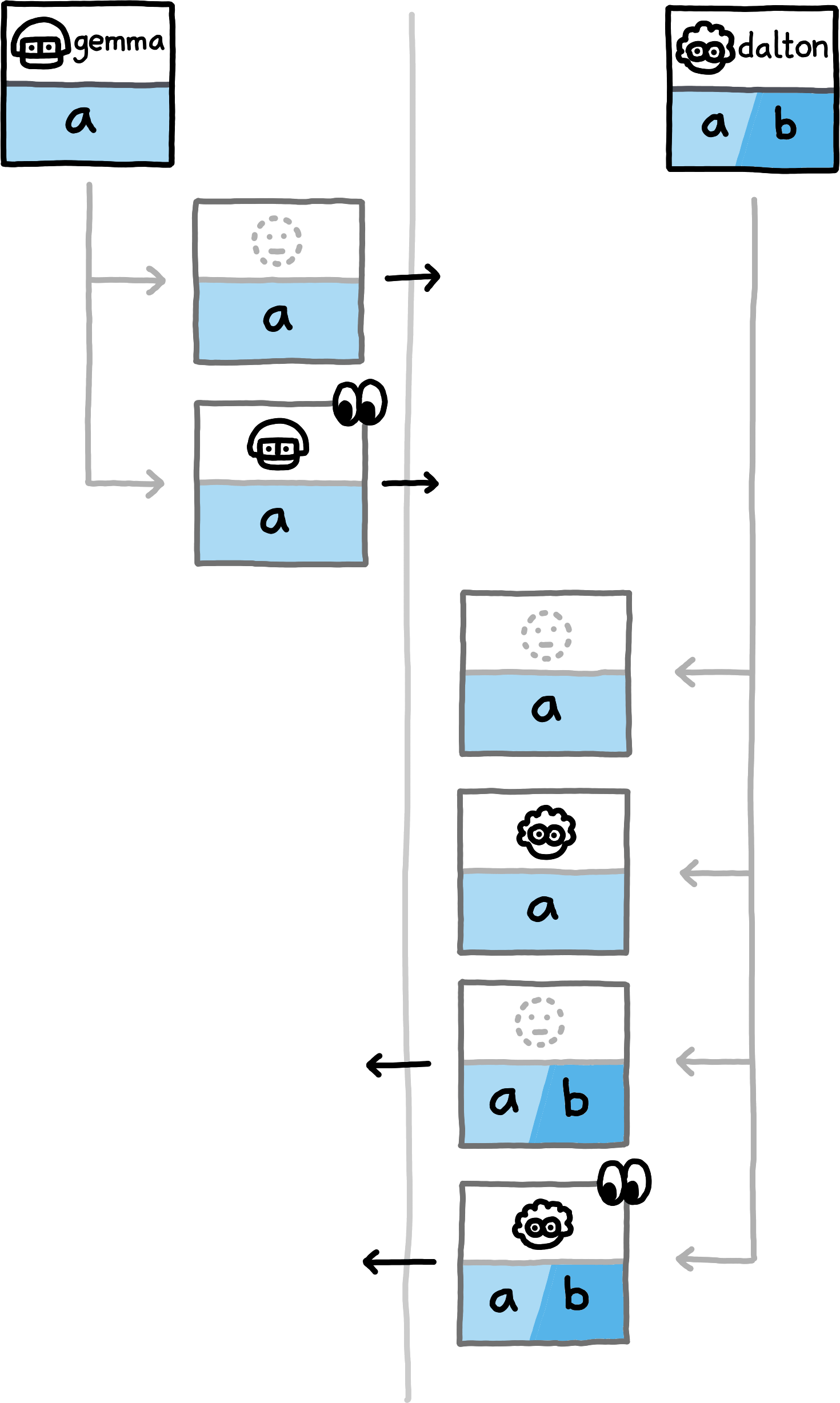 If you replace the concrete examples with the equivalence classes that they represent, you obtain a proof sketch for the correctness of this approach.The examples cover the nine different (up to symmetry) combinations of how subspace_ids and paths can related to each other (equal, non-equal, or any for subspace_ids, prefix, extension, or unrelated for paths). Note that in all examples, both peers also locally compute hashes for PrivateInterests with the empty Path. For brevity we do not depict those, since in these examples they never match any transmitted hashes.